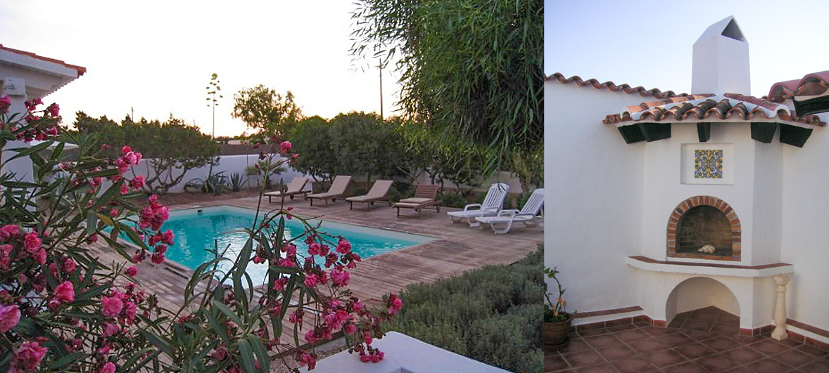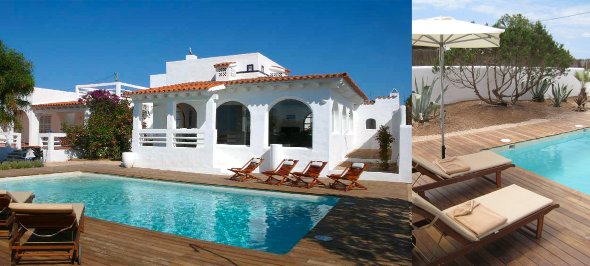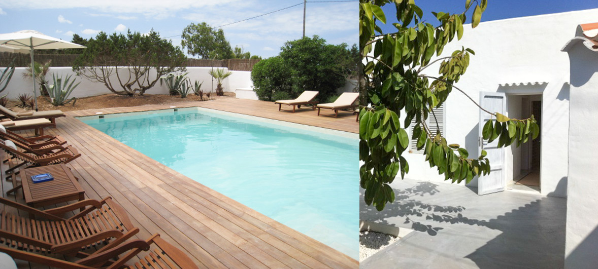 There is a large patio with a dining table for 10, with an oven for the BBQ. The house is surrounded by a small and very neat garden, completely fenced and protected, where you find a large (m5 x m10) swimming pool with its stylish wooden deck, equipped with a lot of lounge chairs.  The superb roof terrace make a lovely setting to have sunset aperitives, looking towards the Ibiza island.