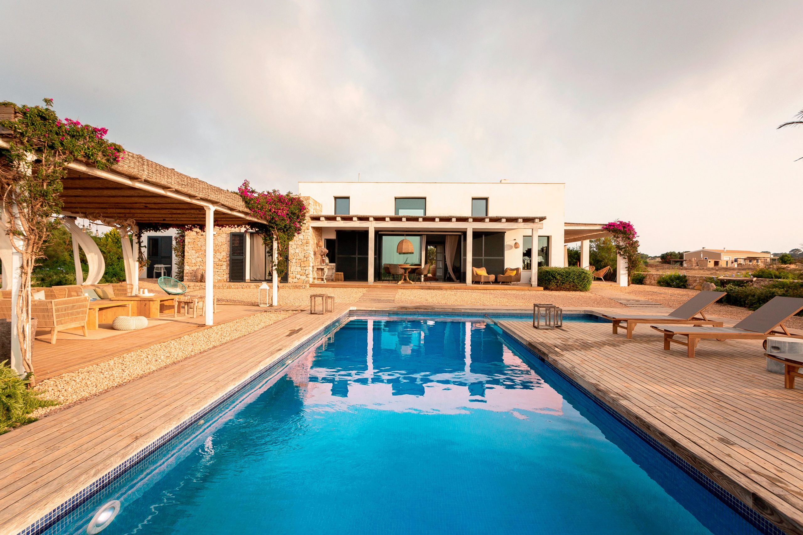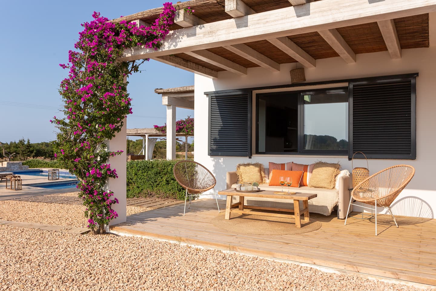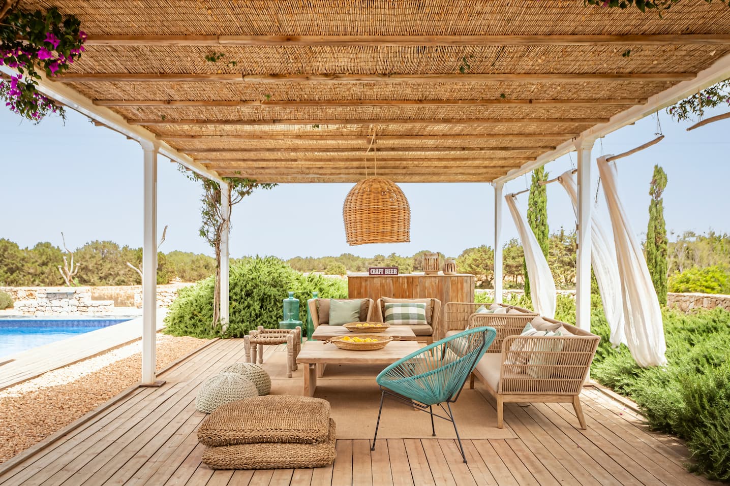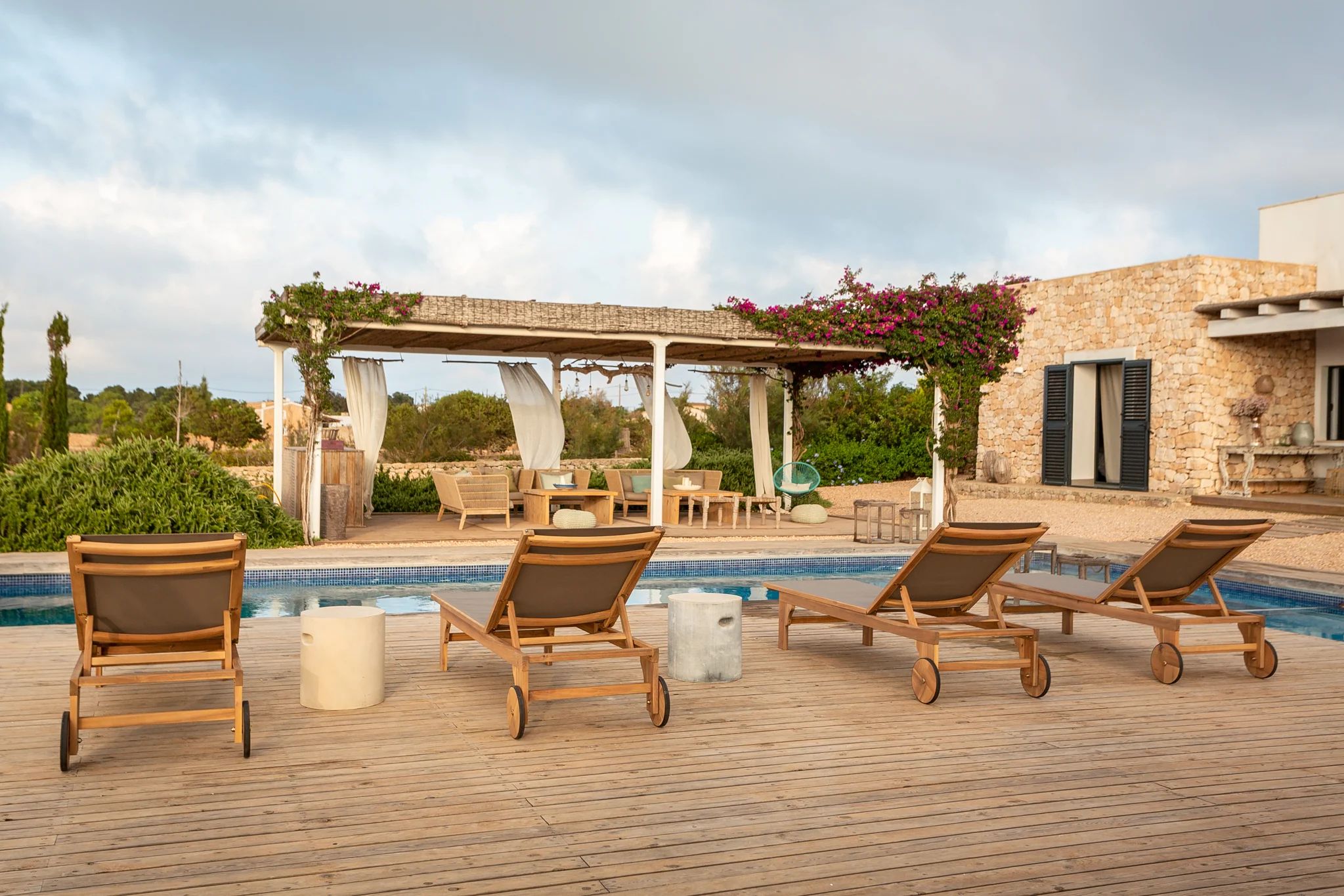 Dine alfresco on the terrace which is equipped with a bbq, table and benches; perfect for watching the famous Formentera sunsets. Relax on the exquisitely decorated terrace overlooking the pool, perfect for a leisurely breakfast . The garden is filled with the calming aromas of rosemary and lavender. In the centre of the garden is a large swimming pool with Pergola, chill out area with tables and sofas, along with the relaxation area with loungers and cushions.Â