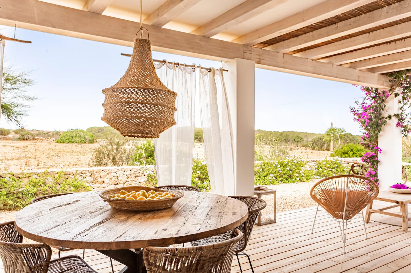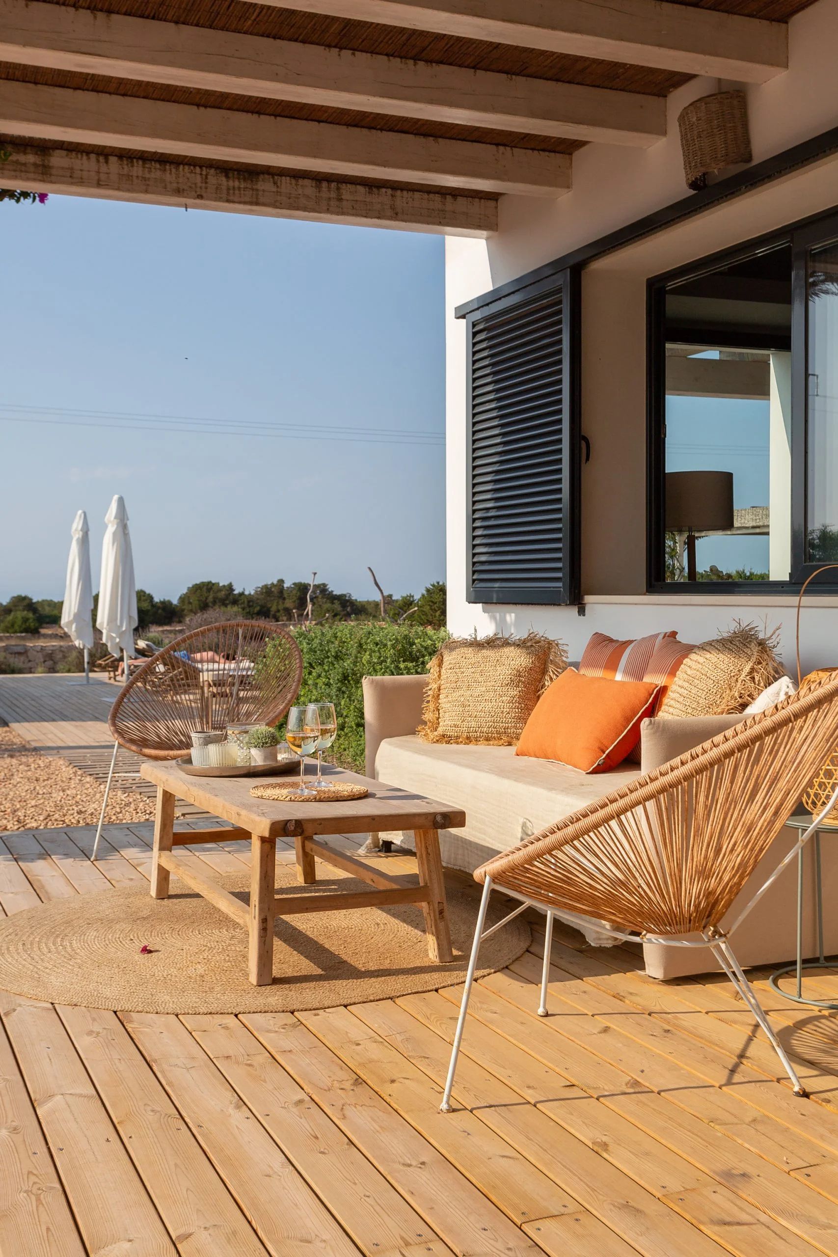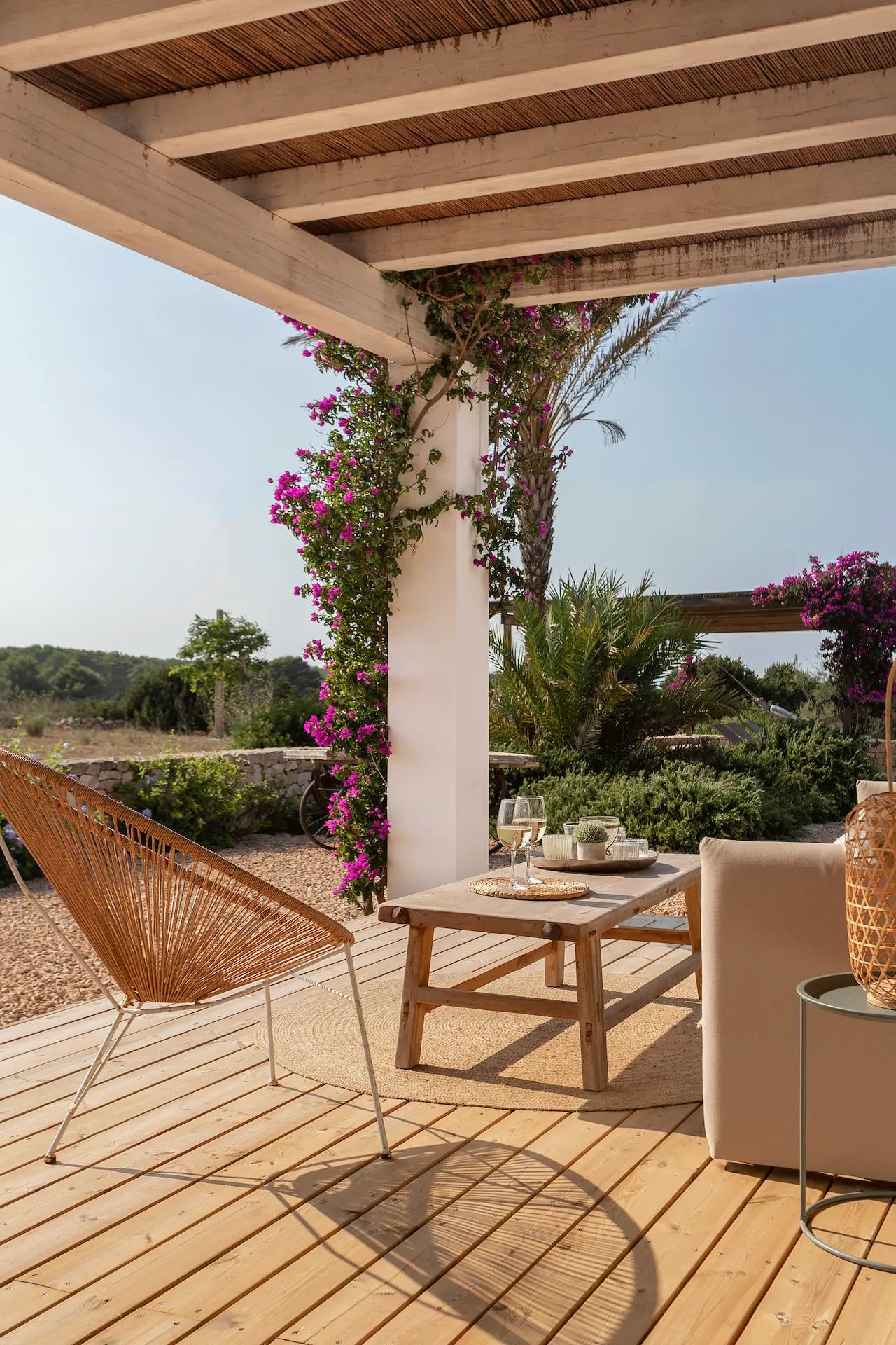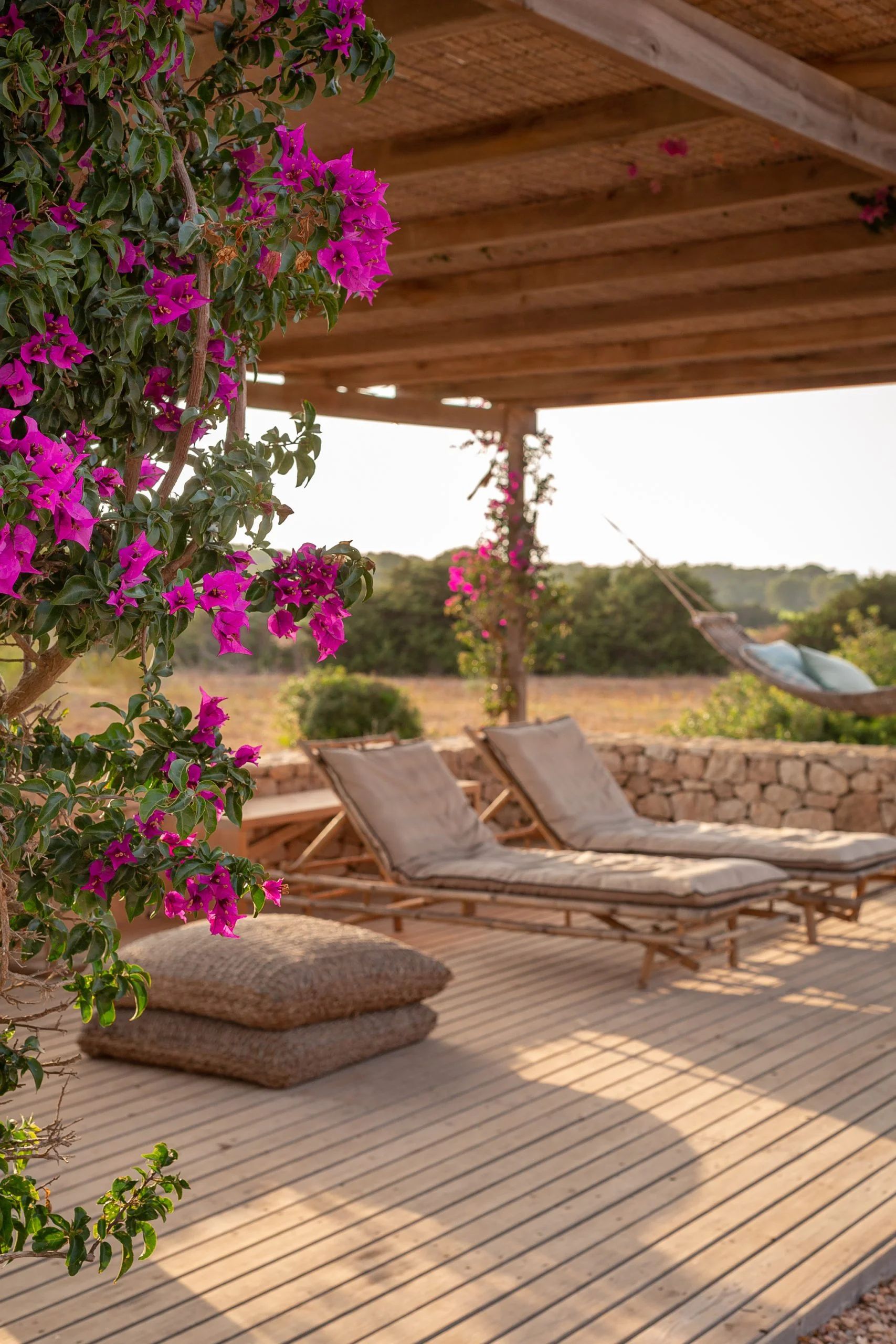 Dine alfresco on the terrace which is equipped with a bbq, table and benches; perfect for watching the famous Formentera sunsets. Relax on the exquisitely decorated terrace overlooking the pool, perfect for a leisurely breakfast . The garden is filled with the calming aromas of rosemary and lavender. In the centre of the garden is a large swimming pool with Pergola, chill out area with tables and sofas, along with the relaxation area with loungers and cushions.Â