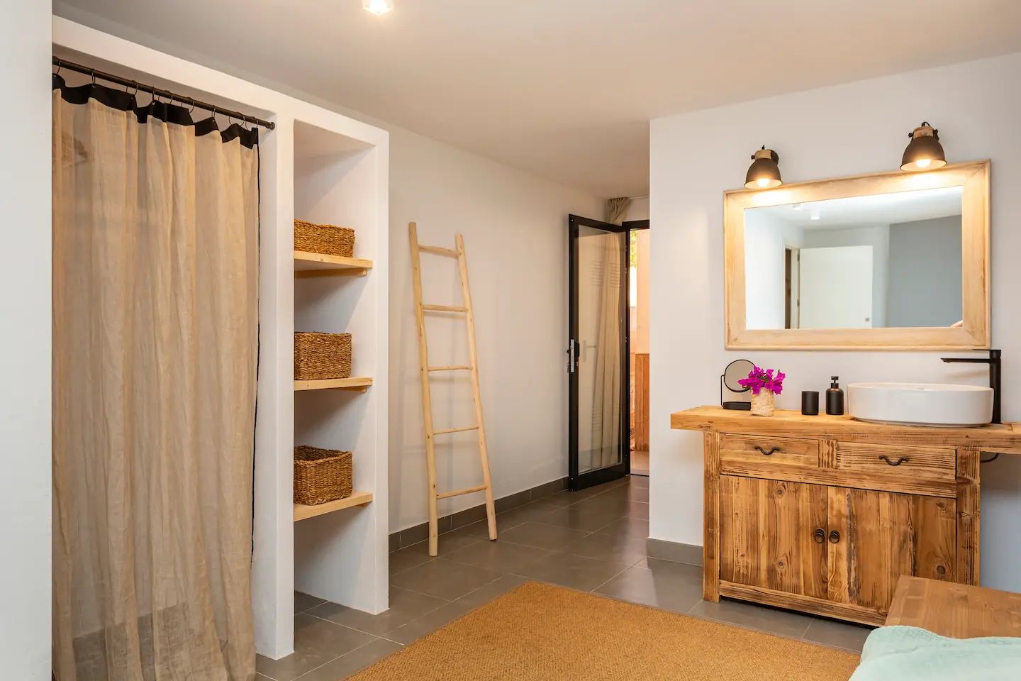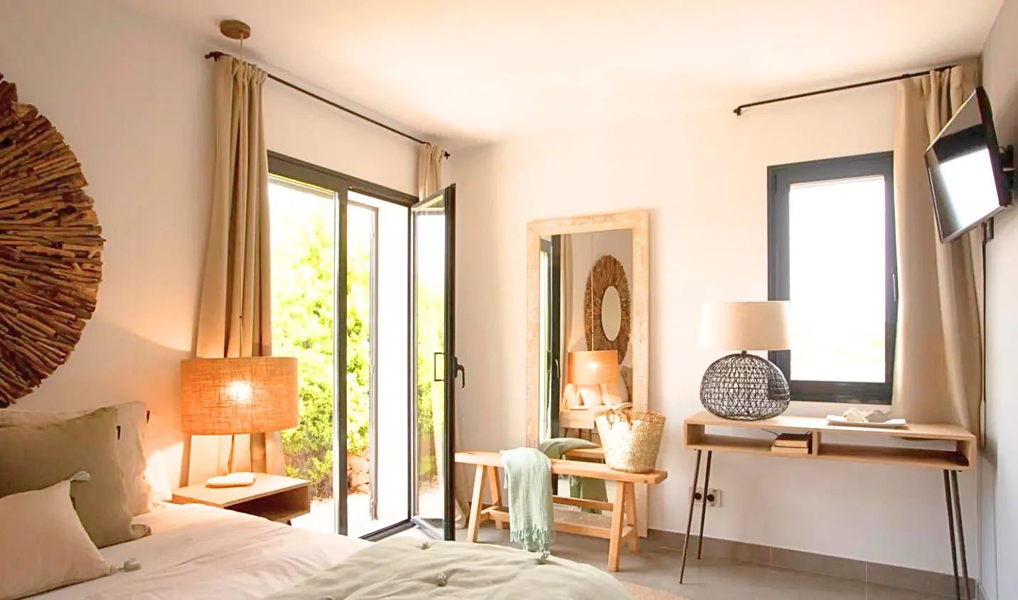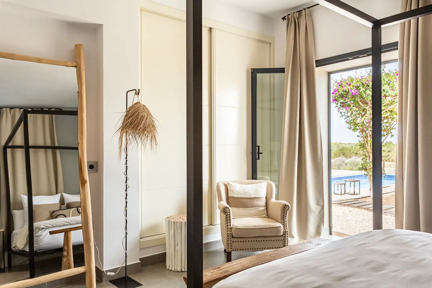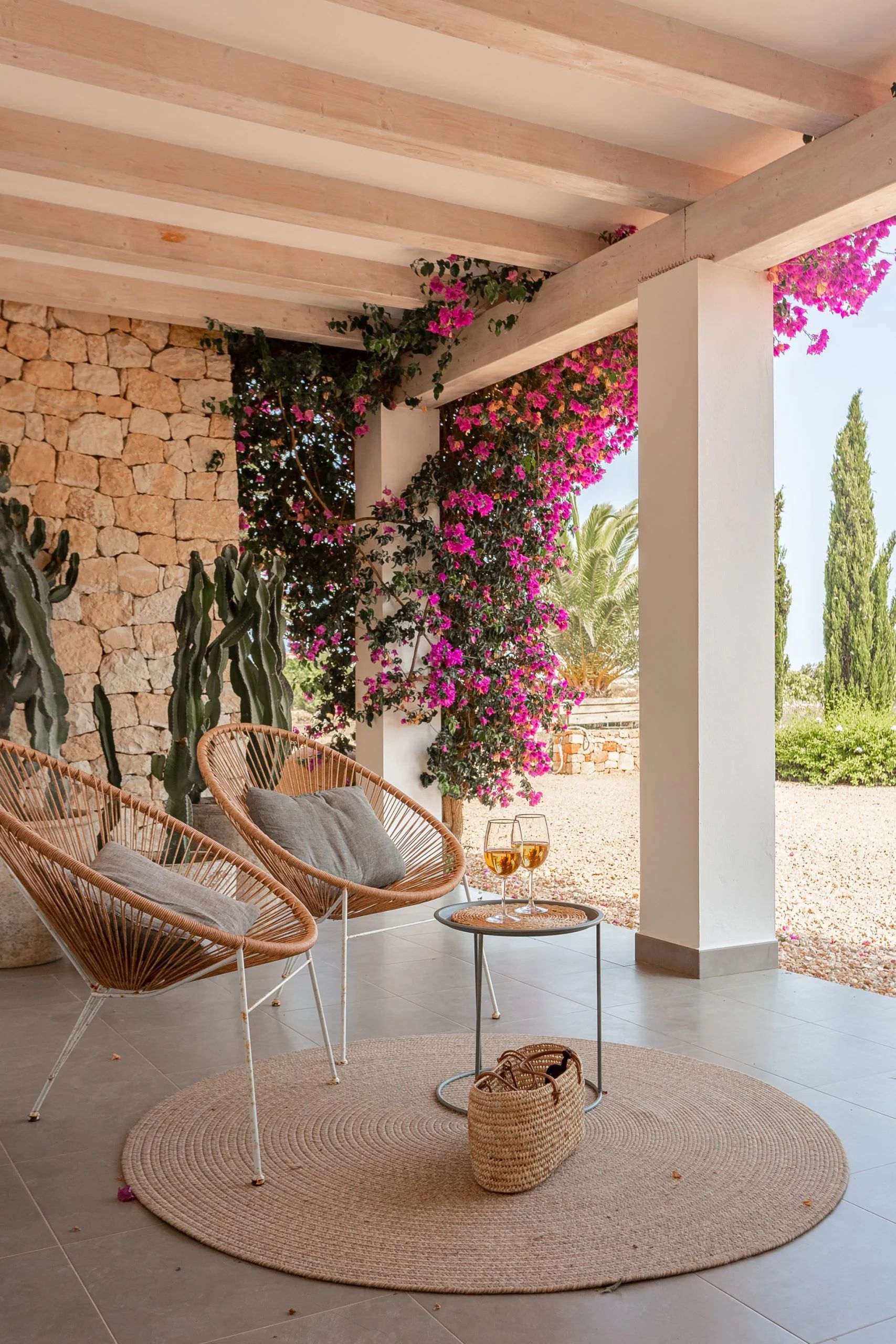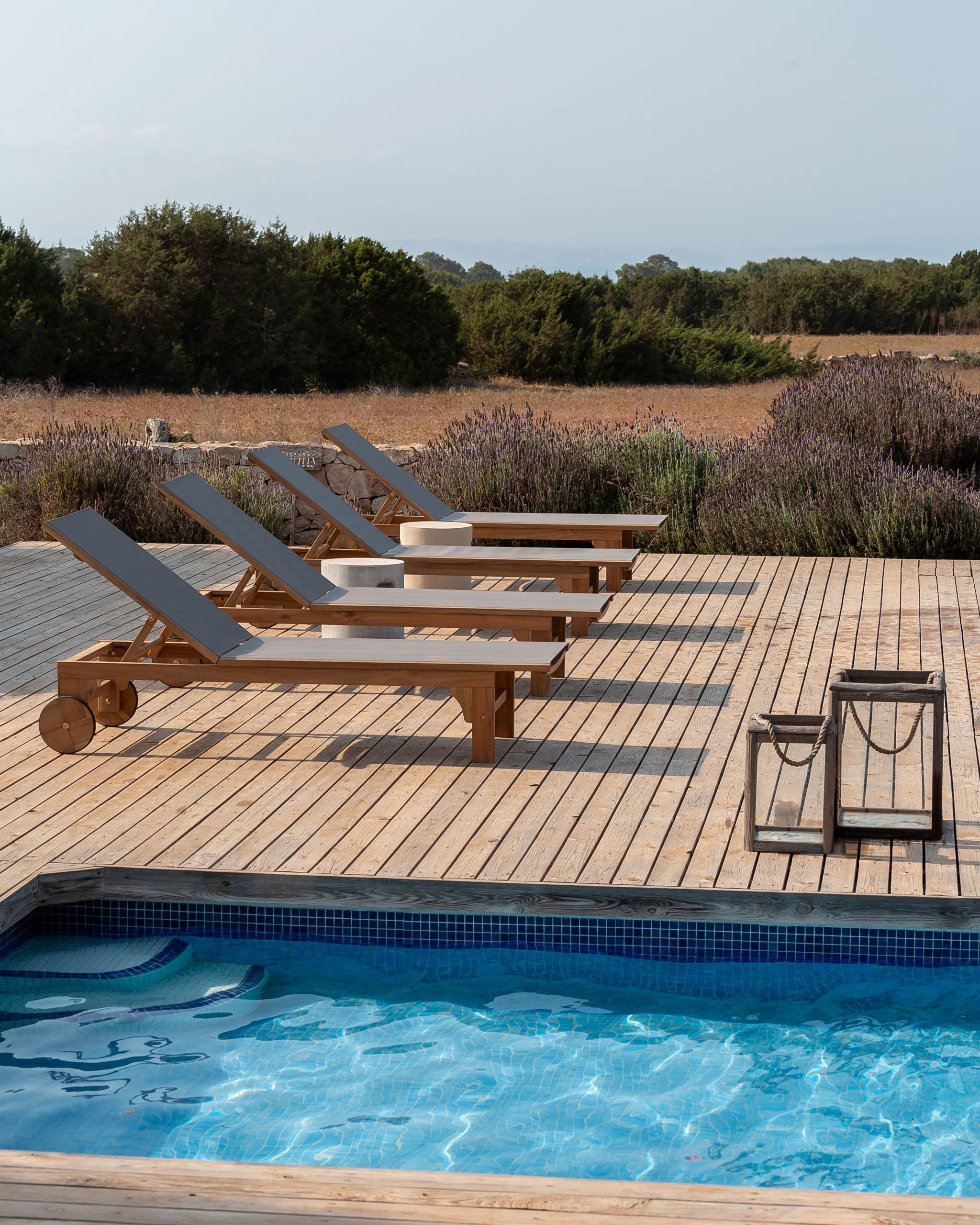 Dine alfresco on the terrace which is equipped with a bbq, table and benches; perfect for watching the famous Formentera sunsets. Relax on the exquisitely decorated terrace overlooking the pool, perfect for a leisurely breakfast . The garden is filled with the calming aromas of rosemary and lavender. In the centre of the garden is a large swimming pool with Pergola, chill out area with tables and sofas, along with the relaxation area with loungers and cushions.Â