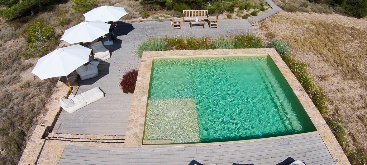 This home is located in Can Parra, a rural and agricultural region of the island of Formentera. The villa sits on a generous plot of 15’000 sq m with the house itself camouflaged by a row of low pines, further ensuring its privacy and serene environment. Thyme and rosemary enclose the wooden walkway, and around the square swimming pool which can be found in a further field off to the side of the villa. The pool is made of natural materials which reflect a green tone, blending it nicely into its Mediterranean surroundings. The sea is just 200 metres away.