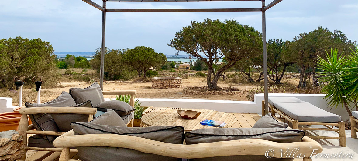 Outside the house has a relaxed vibe with a furnished terrace and a clear view over the sea and Ibiza. Perfect for entertaining in the warm summer evenings.